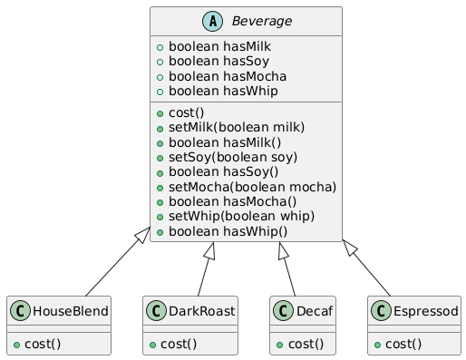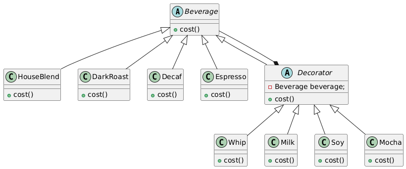 Beverage whipMilkSoyHouseBlend = new Whip(new Milk(new Soy(new HouseBlend())));